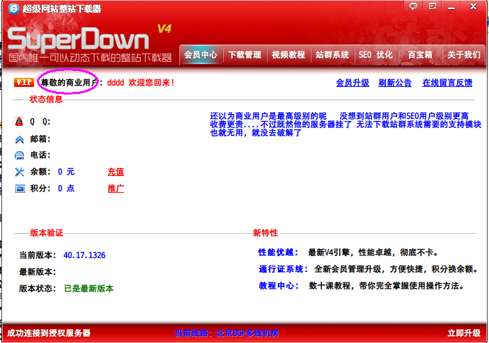 发现这货居然升级到了V4.0版 而且运行就要登陆 还增加了什么SEO用户 站群用户….